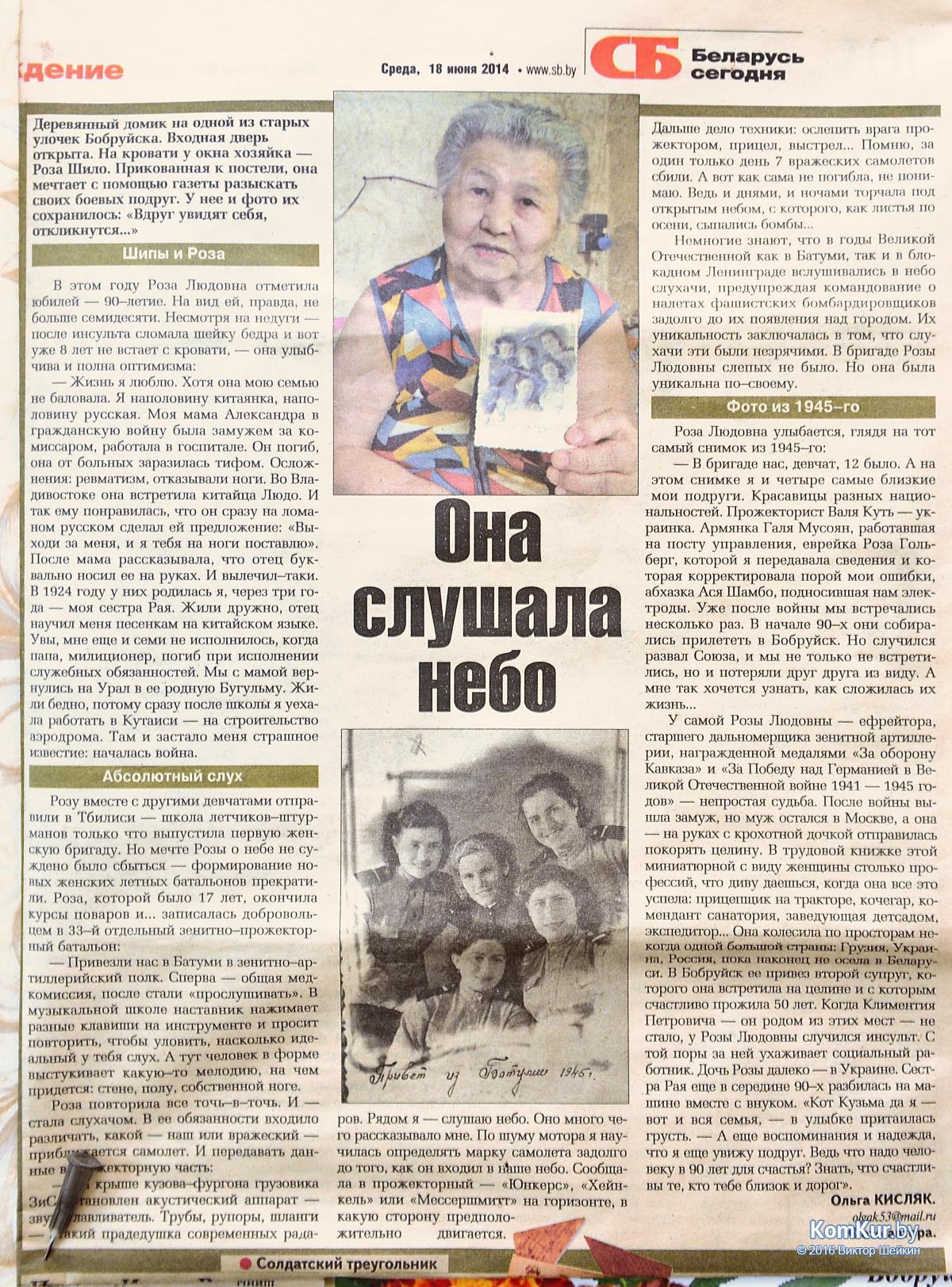 9 мая представители горисполкома – начальник управления идеологической работы, культуры и по делам молодежи Николай Балюк, заместитель начальника Елена Концевая, заведующий сектором по работе с общественными объединениями, религиозными общинами и по делам молодежи Игорь Нестерович – с цветами и подарками пришли в гости к женщине-ветерану, которая уже десять лет не может сама присутствовать на празднике Победы. Роза Людовна Шило в 2006 году после инсульта неудачно упала и повредила ногу. Во время войны в свои 17 лет она была слухачом в 33-м отдельном зенитно-прожекторном батальоне в Батуми: Роза Шило различала по шуму мотора, свой или вражеский летит самолет, информацию передавала командованию. Сегодня на груди у 92-летней женщины – медали «За Победу над Германией», «За оборону Кавказа» и юбилейные награды.