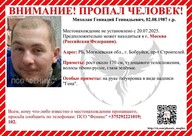 Пропал бобруйчанин Михолап Геннадий Геннадьевич, 1987 года рождения, сообщили в ПСО «Феникс».