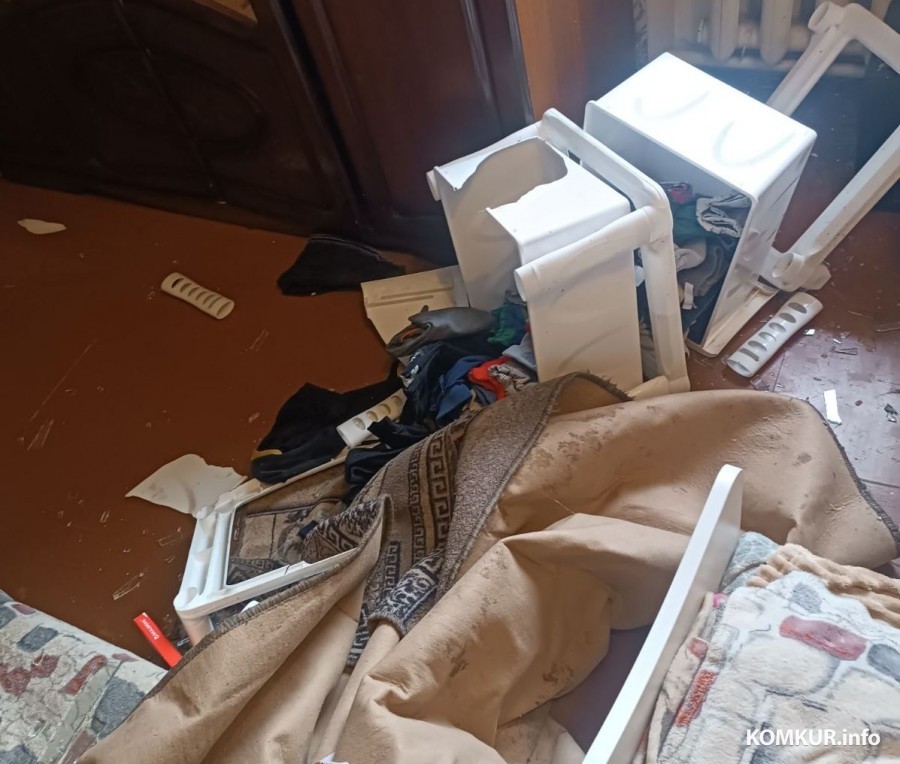 Окно, через которое влез лось уже заделали пленкой, с кровати сняты матрасы, с пола убраны ковры.