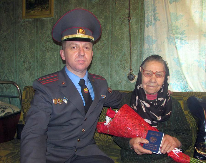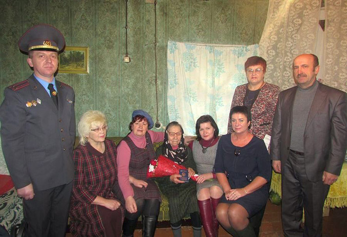 Начальник Бобруйского РОВД Михаил Ермалович вручил ровеснице века, как и полагается в этом возрасте, новый паспорт. И конечно, как же без подарков! Гости дарили цветы, наборы продуктов и сладостей, сертификат на приобретение бытовой техники и многое другое.