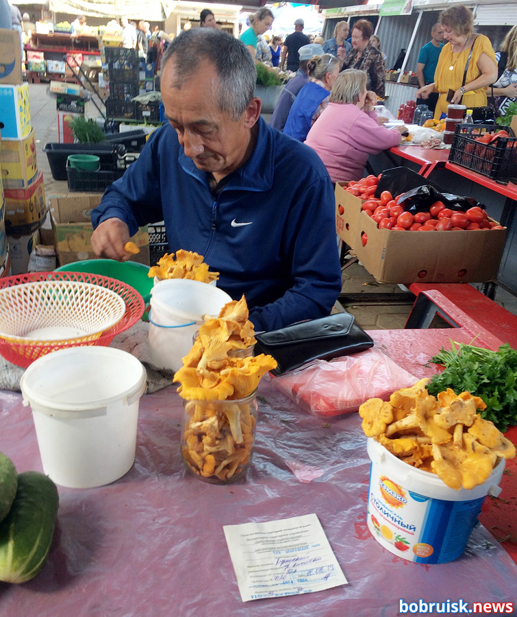 После обильных дождей лисичек здесь в достатке. Пол-литровая баночка – рубль, литровое ведерко – 1.80 – 2 рубля. Торгуют ими и на вес, за килограмм просят – пять рублей, но можно поторговаться. Есть и брусника – цена та же, что была в пятницу на рынке на улице Красноармейской. Не в изобилии, но все же продаются белые и подосиновики, этот товар не на вес и не баночками, а кучками. От величины данной единицы измерения зависит и цена – три, пять, шесть рублей. Хозяйка говорит, что собрала свои белые за Титовкой, другие продавцы называют места сбора – за Дубовкой, в Осиповичском, Кировском районах. Справки о лабораторной проверке есть у всех торговцев.