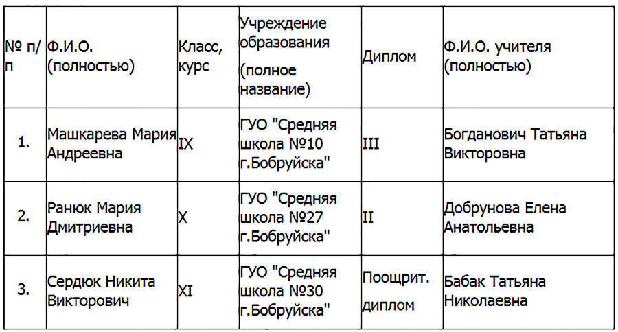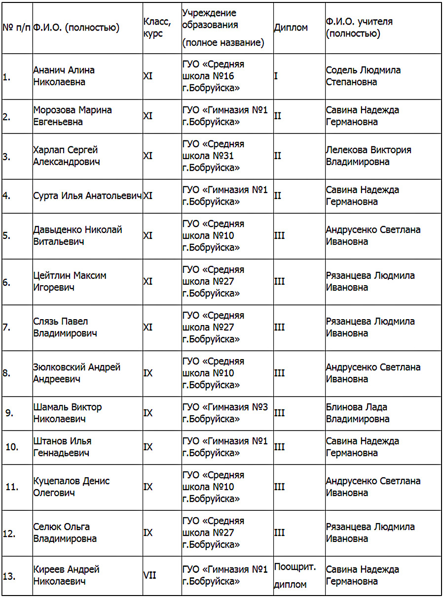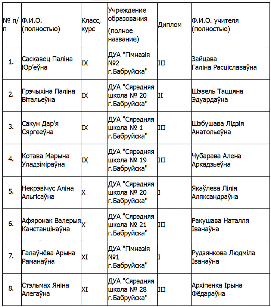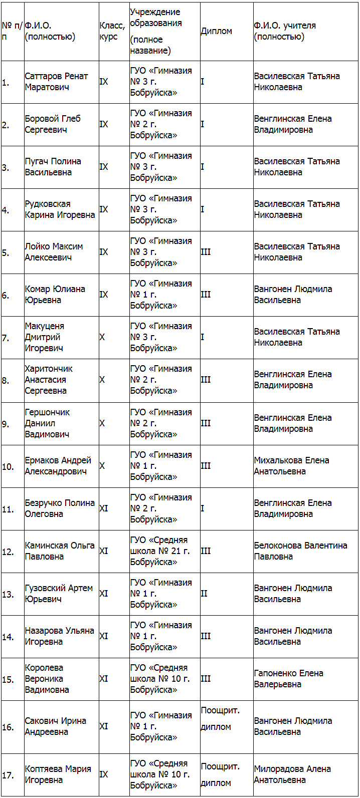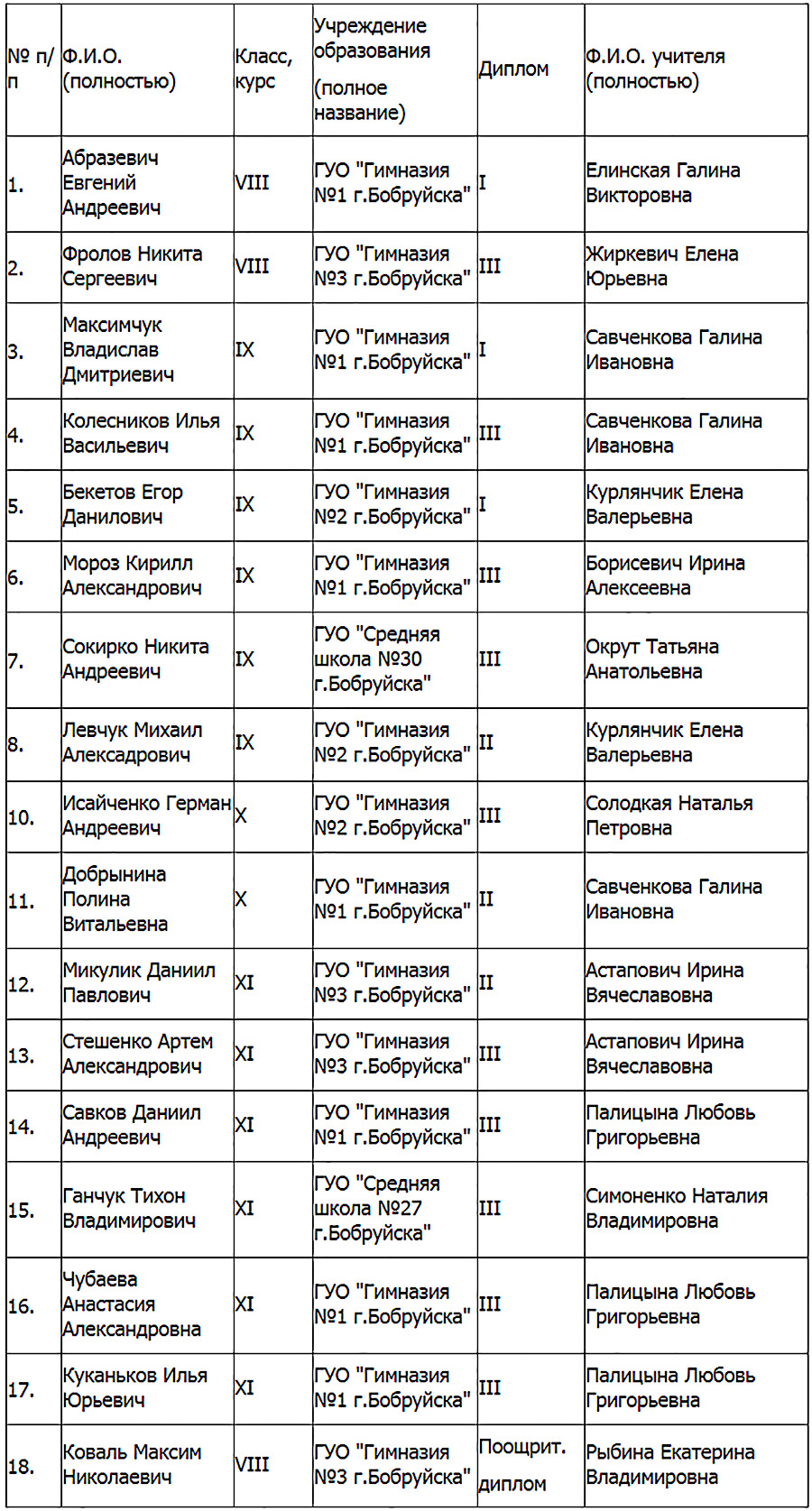 В третьем этапе в составе бобруйской команды приняли участие 213 учащихся учреждений общего среднего и среднего специального образования города – по 17 учебным предметам.