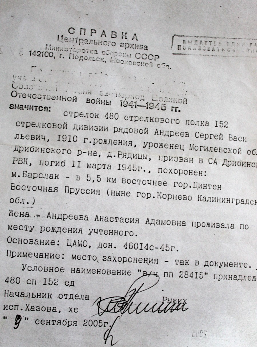 – Мама писала много раз в военкоматы с просьбой указать место, где отца похоронили. Но приходили ответы – не установлено, – продолжает она. – Только двадцать лет тому из Подольска пришла справка с указанием места. Но мамы уже не было. Я мужа только похоронила. Как поехать? А так хотелось поклониться отцу, у могилки постоять. Сейчас я никуда не могу поехать – здоровье мое такое, что уже на улицу не выхожу.