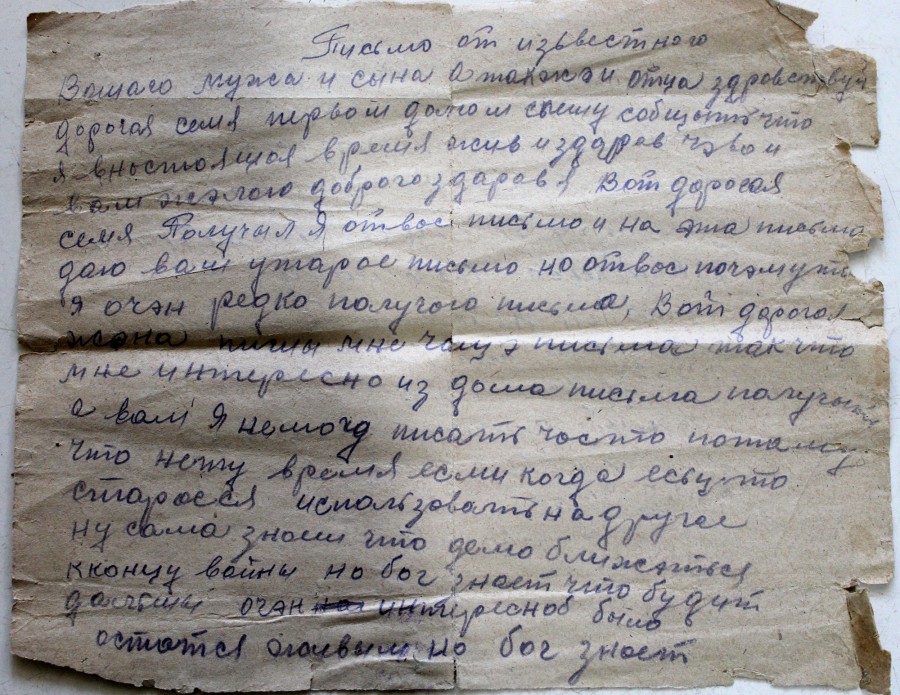 …Письмо от известного вашего мужа и сына, а также от отца. Здравствуй, дорогая семья. Первым долгом спешу сообщить, что я в настоящее время жив и здоров, и вам желаю доброго здоровья. Вот, дорогая семья, получил я от вас письмо и пишу вам письмо. Но от вас почему-то я очень редко получаю письма. Вот, дорогая жена, пиши мне чаще письма, так как мне интересно из дома письма получать.