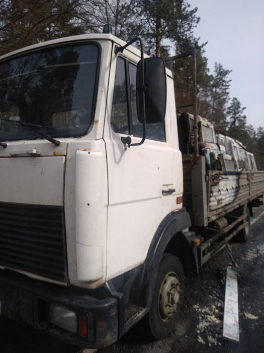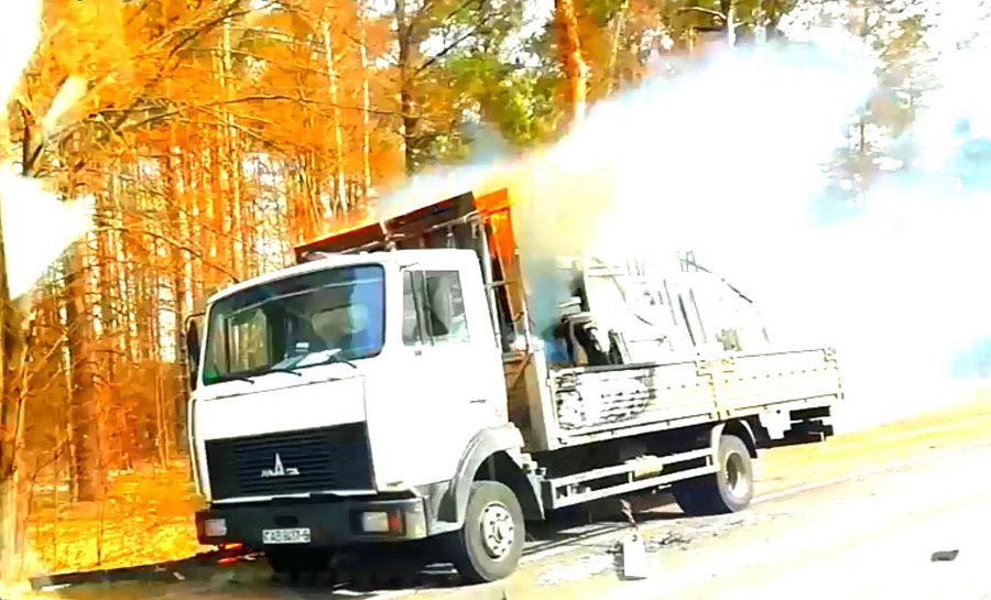 На кадрах видно, что МАЗ находится на обочине, передняя часть кузова объята пламенем. На месте происшествия работают экипажи ГАИ и БГРОЧС.