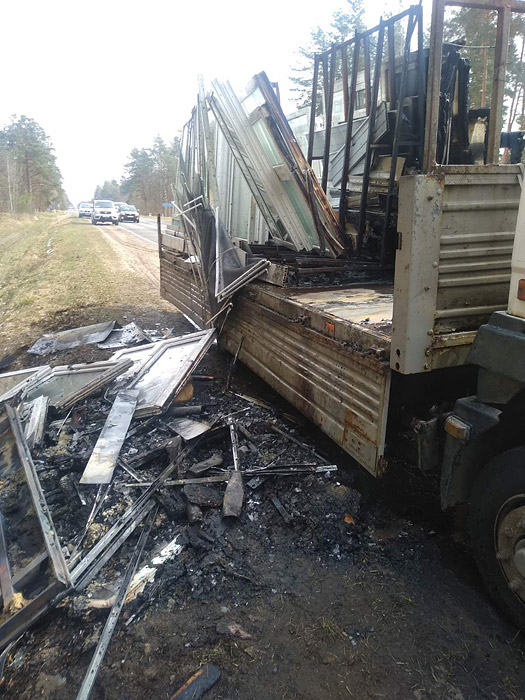 Кадры горящего грузовика появились сегодня около полудня в Телеграм-канале «Дороги Бобруйска». Автор публикации сообщил, что машина находится на автодороге Р43 (Кричев – Бобруйск – Ивацевичи) за развязкой с объездной автодорогой.