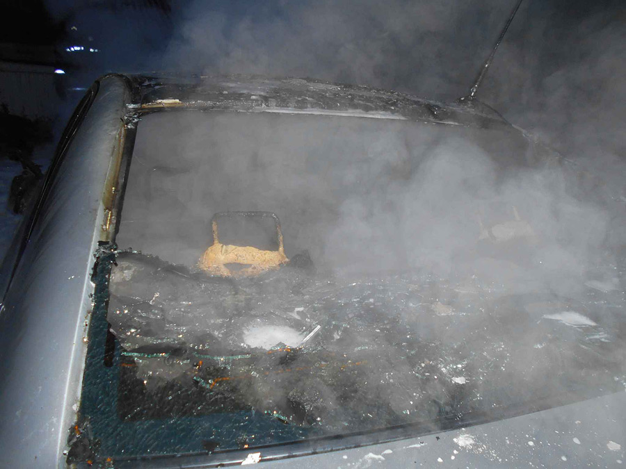 Огонь потушили быстро. Последствия: повреждена передняя часть автомобиля и салон.