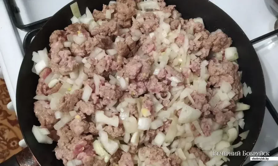 Все овощи мелко нарезаем. Фарш хорошо обжариваем с луком.