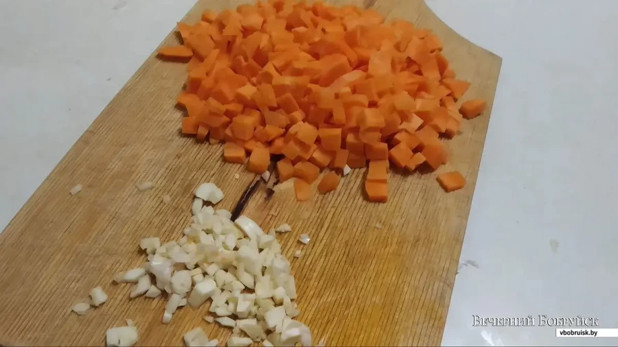На второй сковороде сначала обжариваем морковь и чеснок. Морковь из всех овощей готовиться дольше всего, а обжаренный чеснок будет придавать аромат соусу.