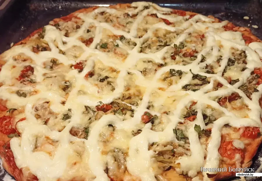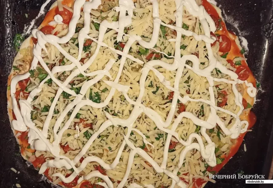 9. Когда тесто «подоспело», раскатываем его в тонкий круг, смазываем кетчупом. Сверху выкладываем начинку: морепродукты, сыр, зелень, немного смазываем майонезом.