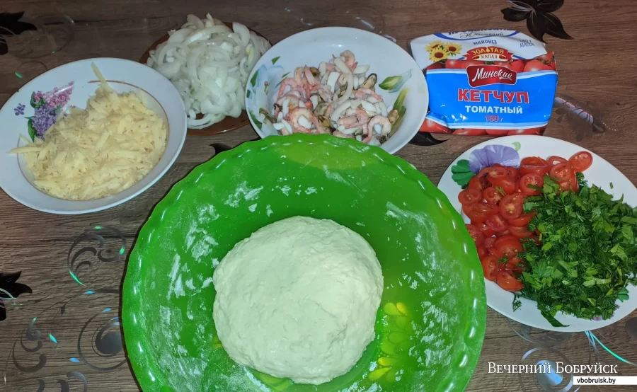 Для начинки: по 250 г кальмаров и креветок (можно взять набор замороженных), 2 помидора, 1 луковица, 200 г твердого сыра, 150 г кетчупа, зелень по вкусу.