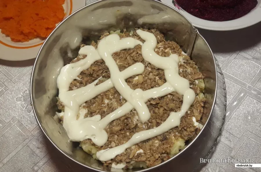 Все слои смазываем майонезом. Вот так: