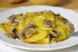 4. Продолжаем перемешивать до тех пор, пока не увидим, как ломтики картофеля становятся клейкими, т.к. картофель начинает выделять крахмал. Одновременно разогреваем сковороду для грибов, добавляем 1 ст. ложку оливкового масла, выкладываем грибы, солим.