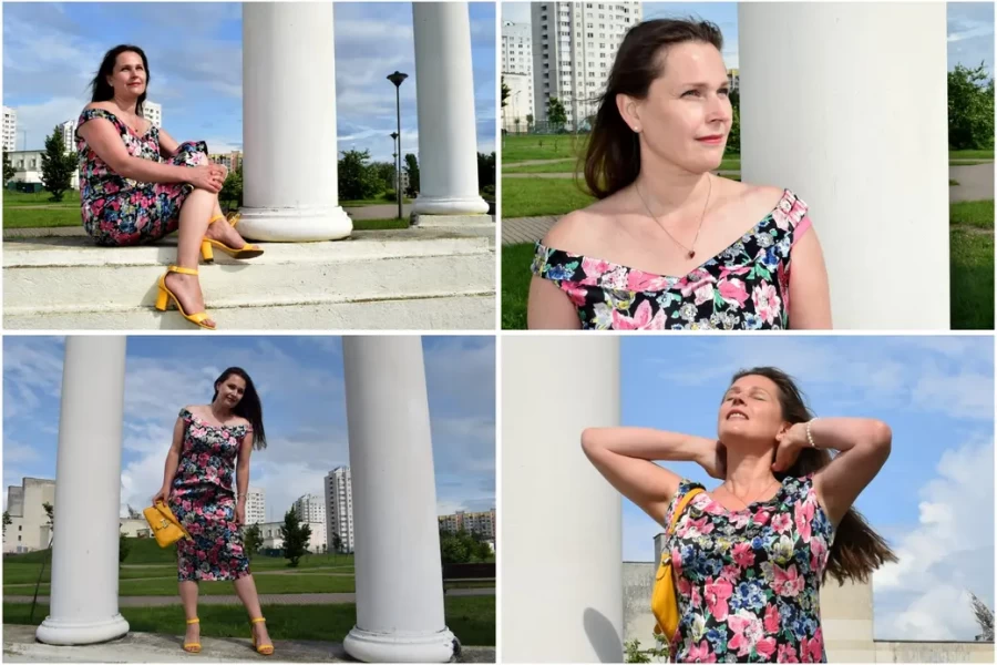 – Образ можно сделать менее акцентным, заменив сумочку, как я это иногда делаю, – говорит Надя. – Сюда также хорошо подходит горчичная сумочка от белорусского бренда «Галантея» за 100 руб., которая идеально сочетается с горчичными босоножками и вкраплениями желтого на топе. По деньгам этот образ получился копеечный, а по смыслу и исполнению- уникальный. Живи сейчас, наслаждайся летом, нюхай цветы и покупай круглые мятные конфеты – вот манифест этого образа. Да и мой, наверно!