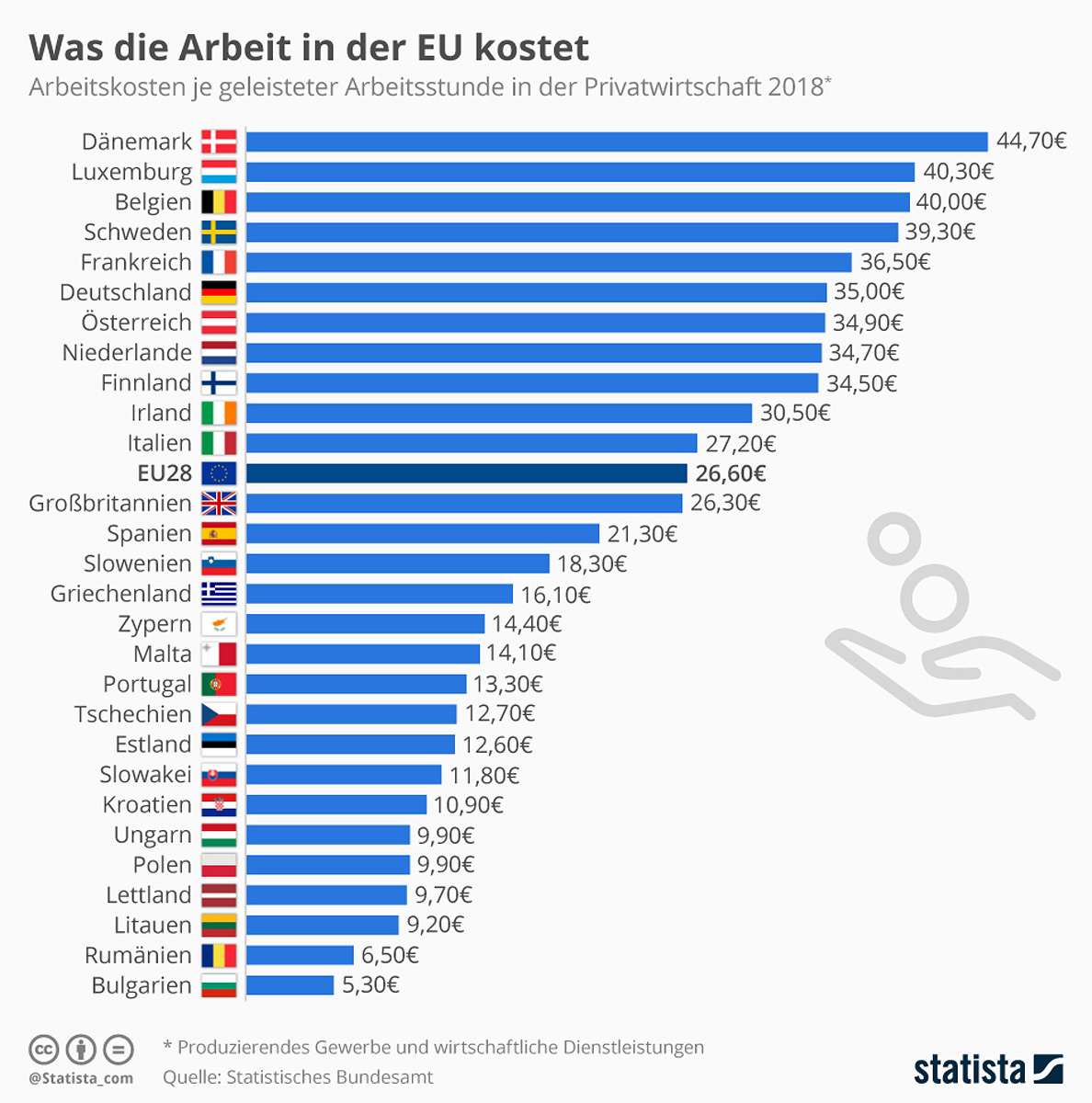 В Германии работодатели оплачивали в обрабатывающей промышленности и в сфере экономических услуг в 2018 году в среднем 35 евро в час. Германия занимает шестое место в сравнении с другими государствами ЕС. На первом месте в рейтинге находится Дания, где затраты на рабочую силу составляют в среднем 44,70 евро в час. Наименее оплачиваемая страна – Болгария, где часовой заработок 5,30 евро.