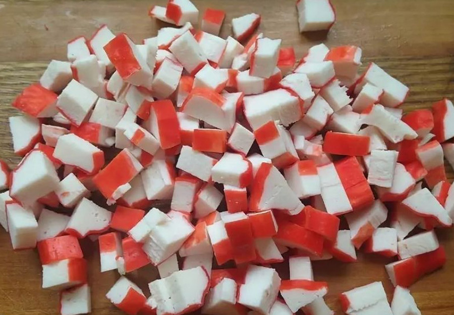 Шаг 1: Крабовые палочки нарезаем средними по размеру кубиками.