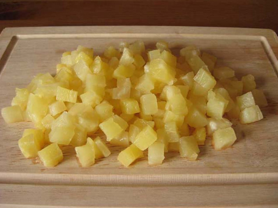 Шаг 3: Ананасы нарезаем небольшими кусочками, жидкость из банки не используем.